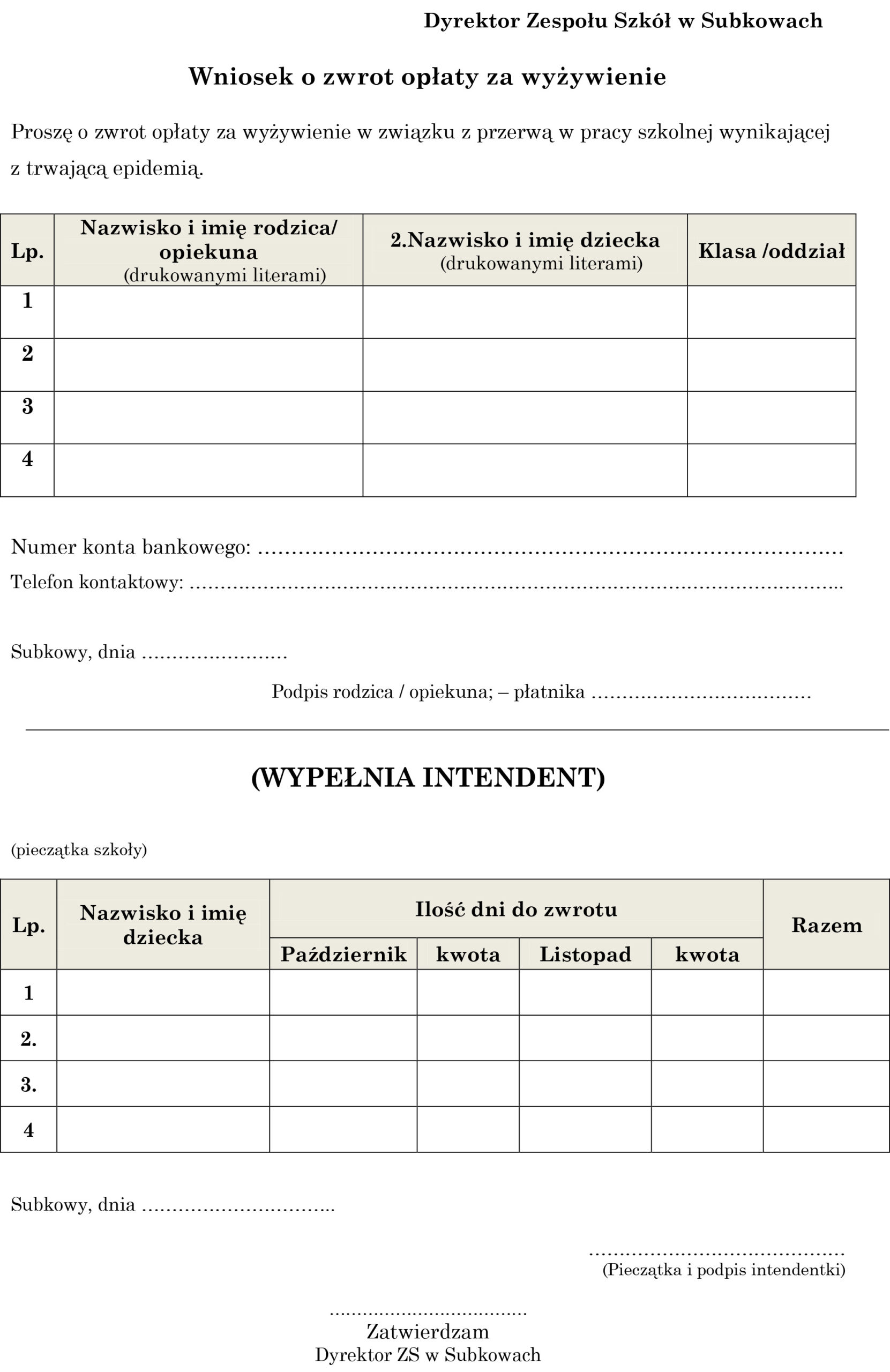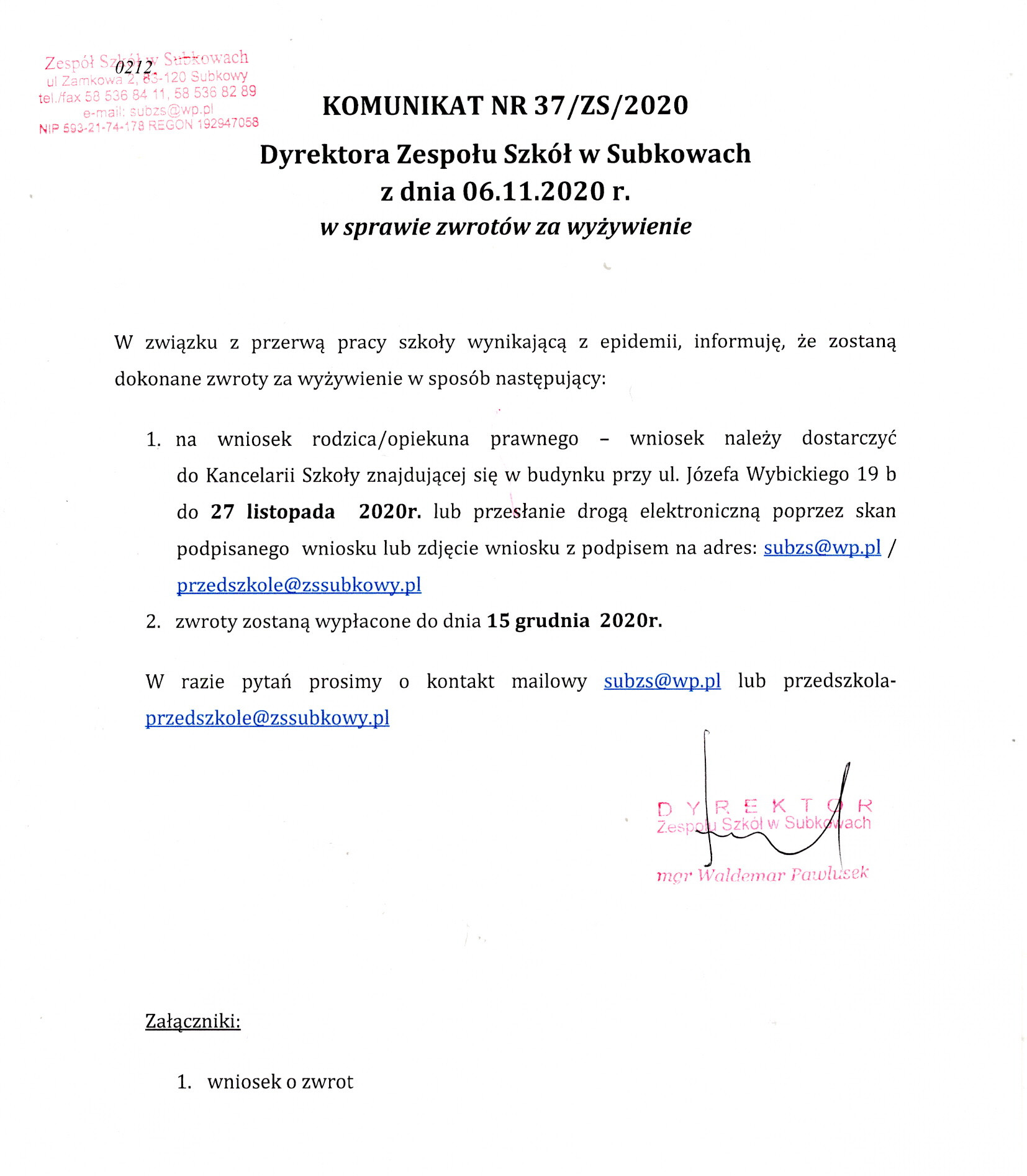 Zwroty za wyżywienie zostaną wypłacone do dnia 15 grudnia 2020r. , na wniosek rodzica/opiekuna prawnego dziecka, który należy pobrać ze strony internetowej szkoły i dostarczyć do sekretariatu ZKPiP w Małej Słońcy w terminie do dnia 27 listopada 2020r. lub przesłać drogą elektroniczną poprzez skan podpisanego wniosku lub zdjęcie wniosku z podpisem na adres szkoły: spmalaslonca@wp.pl.