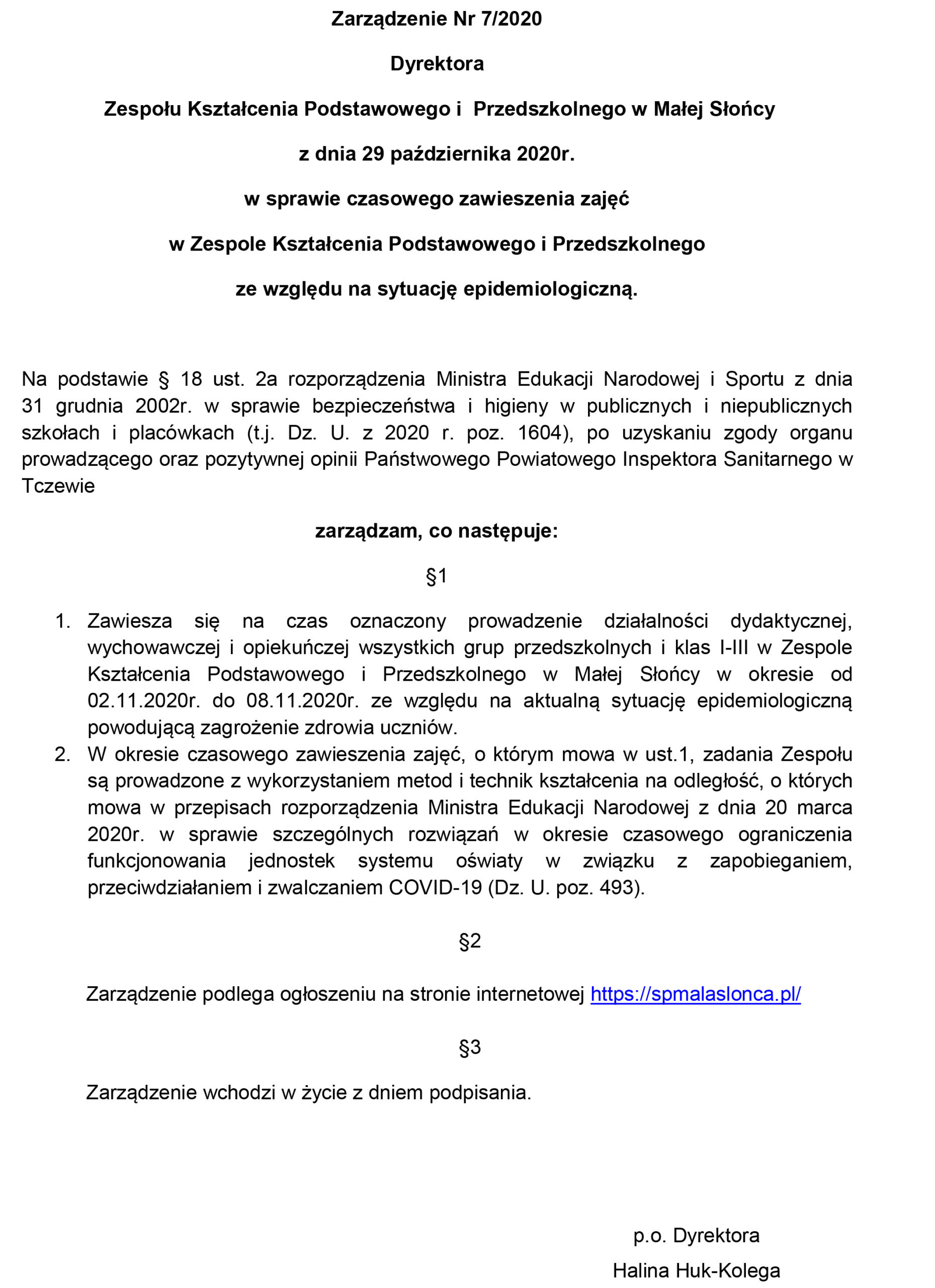 Zarządzenie Dyrektora w sprawie czasowego zawieszenia zajęć w Zespole Kształcenia Podstawowego i Przedszkolnego