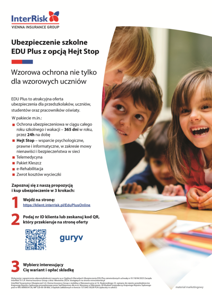 Aby wybrać ubezpieczenie oraz poznać więcej szczegółów należy wejść na stronę https://klient.interrisk.pl/EduPlusOnline i podać kod guryv