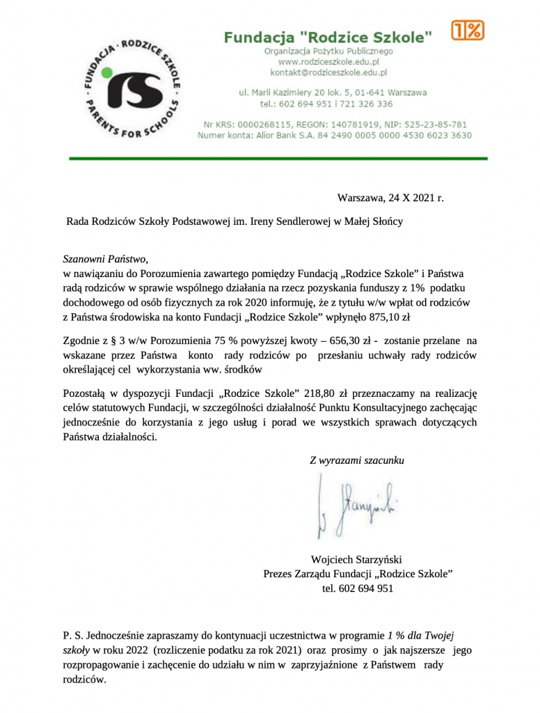 Miło nam poinformować, że w wyniku Porozumienia zawartego pomiędzy Fundacją „Rodzice Szkole” i Radą Rodziców naszej szkoły, udało nam się pozyskać środki w kwocie 656,30 zł.