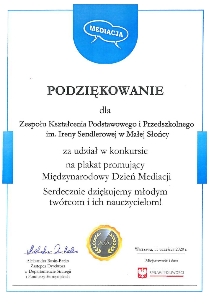 Uczennica kl. VI Daria Czaplicka otrzymała dyplom za udział w konkursie na plakat promujący Międzynarodowy Dzień Mediacji 2020. Szkoła natomiast otrzymała podziękowanie od Organizatora konkursu – Ministerstwa Sprawiedliwości. Wszystkie prace udostępnione zostały w albumie “Konkurs na plakat – MDM 2020” na fanpage’uMediacjahttps://www.facebook.com/mediacja.gov