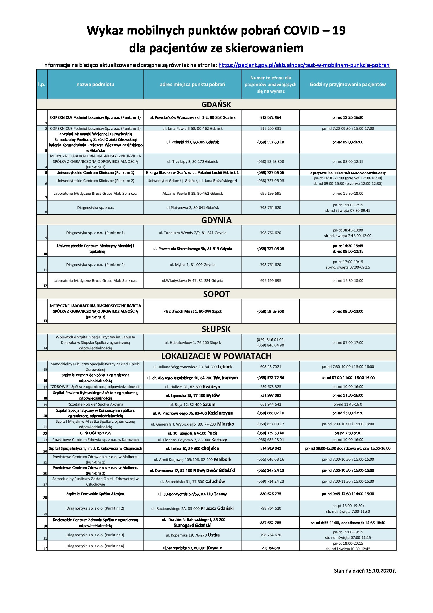 Wykaz mobilnych punktów pobrań COVID – 19 dla pacjentów ze skierowaniem